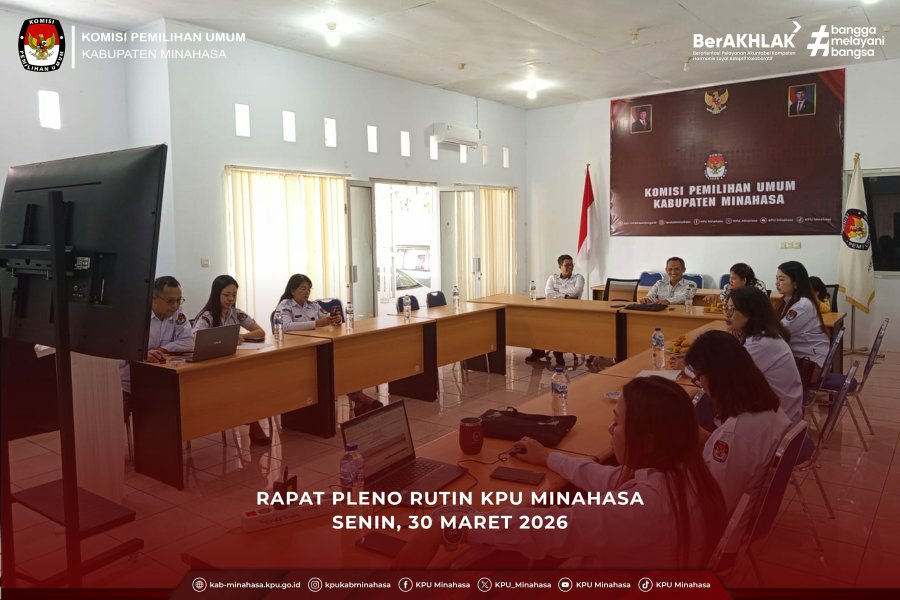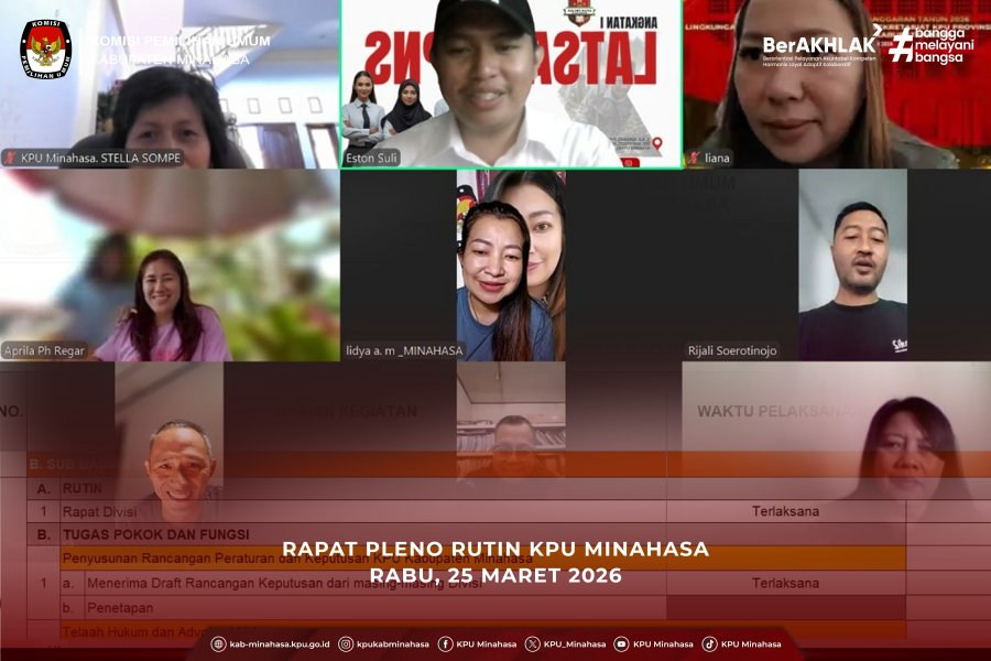 Rapat Pleno Rutin KPU Kabupaten Minahasa berlangsung secara hybrid, yaitu luring dan daring pada Rabu (25/03/2026). Diawali dengan penyampaian laporan kerja dari setiap Sub Bagian sepanjang minggu yang telah berjalan dan diakhiri dengan penyampaian rencana kerja di sepanjang minggu yang akan berjalan. Hadir dalam Rapat, Ketua dan Anggota KPU Kabupaten Minahasa, Sekretaris KPU Kabupaten Minahasa, Para Kasubbag serta Operator dan Notulen. #KPUMelayani ....