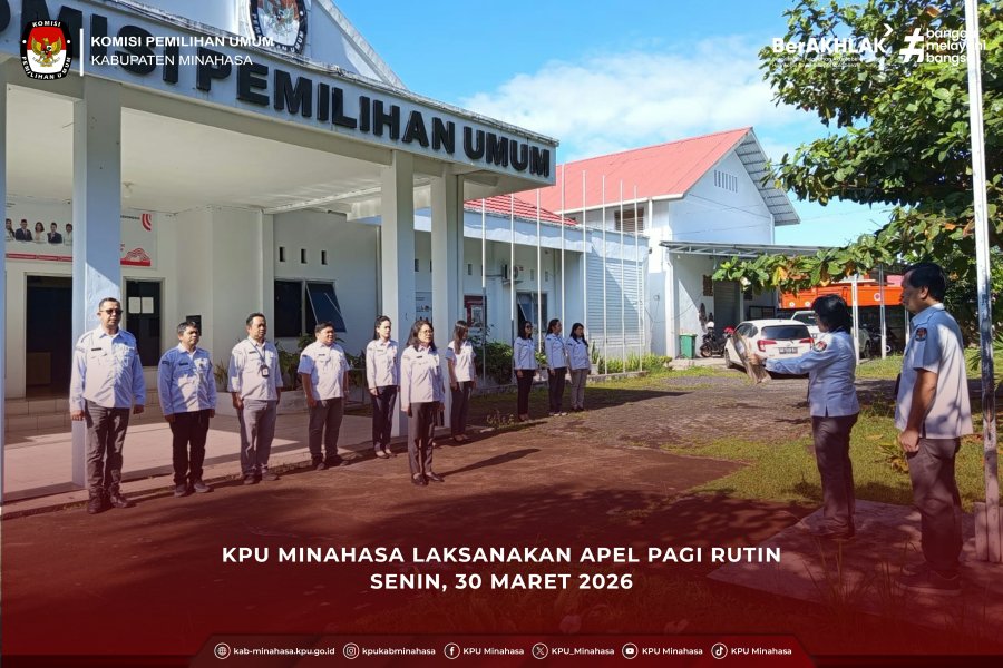 Mengawali kerja di sepanjang minggu ini, KPU Kabupaten Minahasa laksanakan apel pagi rutin, Senin (30/03/2026), Sekretaris KPU Kabupaten Minahasa Stella S. Sompe yang bertindak sebagai Pembina. Turut hadir Kasubbag Perencanaan, Data, dan Informasi, Kasubbag Keuangan, Umum, dan Logistik, Kasubbag Teknis Penyelenggaraan, dan Hukum, Kasubbag SDM dan Parmas serta Jajaran Sekretariat KPU Kabupaten Minahasa. #KPUMelayani ....