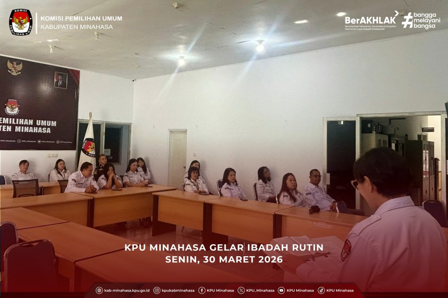 KPU Kabupaten Minahasa melaksanakan ibadah rutin di aula kantor KPU Minahasa pada Senin (30/03/2026). Ibadah ini diselenggarakan sebagai bagian dari pembinaan kerohanian bagi seluruh jajaran KPU Kabupaten Minahasa, dengan tujuan memperdalam iman, memperkuat karakter, serta menumbuhkan semangat kebersamaan dan pelayanan. Melalui ibadah rutin ini, diharapkan setiap insan KPU Kabupaten Minahasa mampu merefleksikan peran dan tanggung jawabnya sebagai penyelenggara pemilu yang berintegritas dan bertanggung jawab. Dengan penguatan rohani yang terus terjaga, seluruh jajaran KPU Kabupaten Minahasa dapat menjalankan setiap tugas dan tanggung jawab secara profesional, serta senantiasa mengedepankan nilai-nilai Kristiani dalam setiap pelaksanaan tugas dan pelayanan kepada masyarakat. #KPUMelayani ....