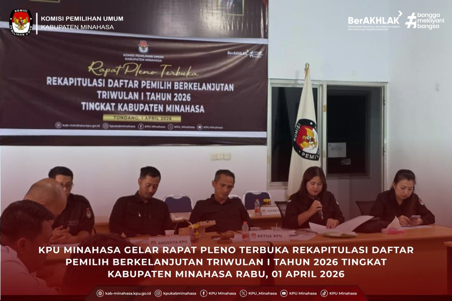 KPU Minahasa Gelar Rapat Pleno Terbuka Rekapitulasi Daftar Pemilih Berkelanjutan Triwulan I Tahun 2026 Tingkat Kabupaten Minahasa di Aula Kantor KPU Minahasa pada Rabu (01/04/2026). Sesuai Peraturan Komisi Pemilihan Umum Nomor 1 Tahun 2025 Tentang Pemutakhiran Data Pemilih Berkelanjutan, KPU Kabupaten Minahasa melaksanakan Pemutakhiran Data Pemilih Berkelanjutan (PDPB) di Kecamatan dan Desa/Kelurahan. PDPB ini bertujuan untuk memelihara dan memperbaharui DPT Pemilu dan/atau Pemilihan terakhir secara berkelanjutan untuk penyusunan DPT pada Pemilu dan/atau Pemilihan berikutnya dengan tetap menjamin kerahasiaan data dan menyediakan data dan informasi Pemilih berskala nasional mengenai Data Pemilih secara komprehensif, akurat, dan mutakhir. Dalam Pelaksanaan PDPB ini Bawaslu Kabupaten Minahasa yang bertugas mengawasi penyelenggaraan Pemilu dan Pemilihan Bupati dan Wakil Bupati di tingkat Kabupaten/Kota bersama-sama ikut mengawasi langsung untuk terlaksananya PDPB di tingkat Kabupaten Minahasa. Hadir dalam kegiatan ini Ketua dan Anggota KPU Kabupaten Minahasa, Sekretaris KPU Kabupaten Minahasa, Kasubbag dan Staf Sekretariat yg membidangi Divisi Perencanaan, Data dan Informasi KPU Kabupaten Minahasa. Turut hadir Bawaslu Kabupaten Minahasa, Dinas Kependudukan dan Pencatatan Sipil Kabupaten Minahasa, dan Badan Kesatuan Bangsa dan Politik Kabupaten Minahasa. #KPUMelayani ....