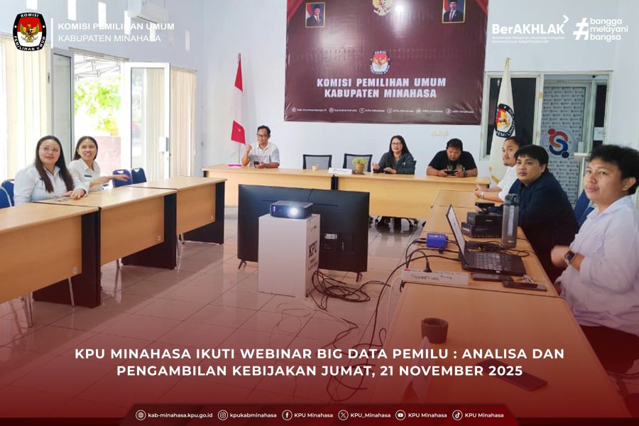 KPU Minahasa mengikuti Webinar Big Data Pemilu : Analisa dan Pengambilan Kebijakan yang diselenggarakan secara daring oleh Sekretariat Jenderal KPU RI dan diikuti oleh seluruh satuan kerja KPU se-Indonesia pada Jumat (21/11/2025).