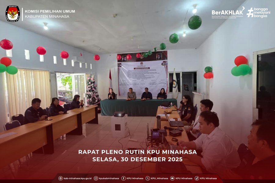Rapat Pleno Rutin KPU Kabupaten Minahasa berlangsung di aula kantor KPU Kabupaten Minahasa pada Selasa (30/12/2025).