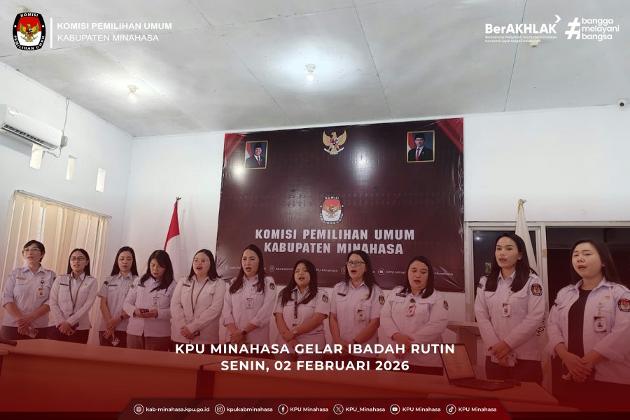 KPU Kabupaten Minahasa melaksanakan ibadah rutin di aula kantor KPU Minahasa pada Senin (02/02/2026). Ibadah ini diselenggarakan sebagai bagian dari pembinaan kerohanian bagi seluruh jajaran KPU Kabupaten Minahasa, dengan tujuan memperdalam iman, memperkuat karakter, serta menumbuhkan semangat kebersamaan dan pelayanan.
