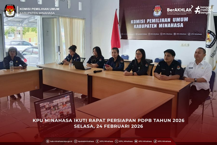 KPU Minahasa Ikuti Rapat Persiapan PDPB Tahun 2026 yang diselenggarakan secara daring oleh Sekretariat Jenderal KPU RI dan diikuti oleh seluruh satuan kerja KPU se-Indonesia pada Selasa (24/02/2026).