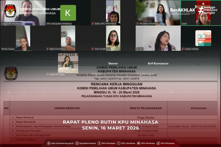 Rapat Pleno Rutin KPU Kabupaten Minahasa berlangsung secara hybrid, yaitu luring dan daring pada Senin (16/03/2026).