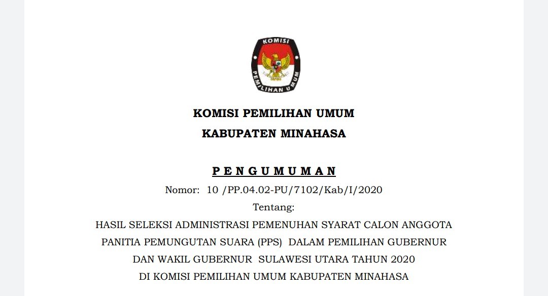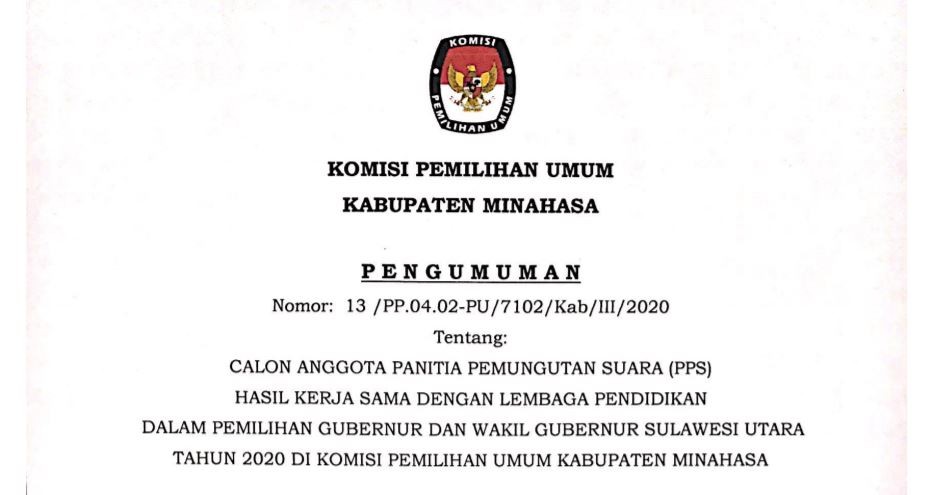 DOWNLOAD PENGUMUMAN CALON ANGGOTA PPS TERPILIH DAN PERINGKAT CALON ANGGOTA PPS PILGUB SULUT 2020 Rabu, 18 Maret 2020 00:00 38 DOWNLOAD PENGUMUMAN CALON ANGGOTA PPS TERPILIH DAN PERINGKAT CALON ANGGOTA PPS PILGUB SULUT 2020 DISINI Baca Selengkapnya