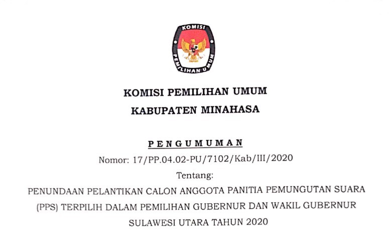 PENGUMUMAN PENUNDAAN PELANTIKAN CALON ANGGOTA PPS PILGUB SULUT 2020 Minggu, 22 Maret 2020 00:00 41 DOWNLOAD PENGUMUMAN PENUNDAAN PELANTIKAN CALON ANGGOTA PPS PILGUB SULUT 2020 DISINI Baca Selengkapnya