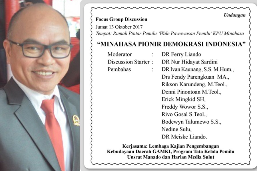 Diketahui, Dr Ferry D Liando SIP MSI akan menjadi moderator dalam diskusi ini yang melibatkan tokoh-tokoh pengiat dan pemerhati budaya, akademisi, Lembaga Swada Masyarakat, Organisasi Masyarakat, penggiat kepemiluan dan sebagainya. Diantaranya, DR Ivan Kaunang, SS MHum (Sejarawan, Budayawan, Dirjen. LKPKD GAMKI), Drs Fendy Parengkuan (Sejarawan, Budayawan, Penasehat PIKI Minahasa), Rikson Karundeng (Budayawan, Wapemred Media Sulut), Denni Pinontoan M Teol (Teolog, Budayawan, Pegiat Mawale Cultural Center), Erick Mingkid SH (Makapetor Center), Freddy Wowor SS (Budayawan, Sastrawan, Akademisi Fakultas Ilmu Budaya Unsrat), Rivo Gosal STeol (Ketua Aliansi Masyarakat Adat Nusantara Sulut, Sek LKPKD GAMKI, Ketua Komunitas Peduli Pemilu KPU Minahasa), Bodewyn Talumewo SS (Sejarawan), Nedine Sulu (Dewan AMAN Nasional) dan DR Meiske Liando (Wadir LKPKD GAMKI). (admin)