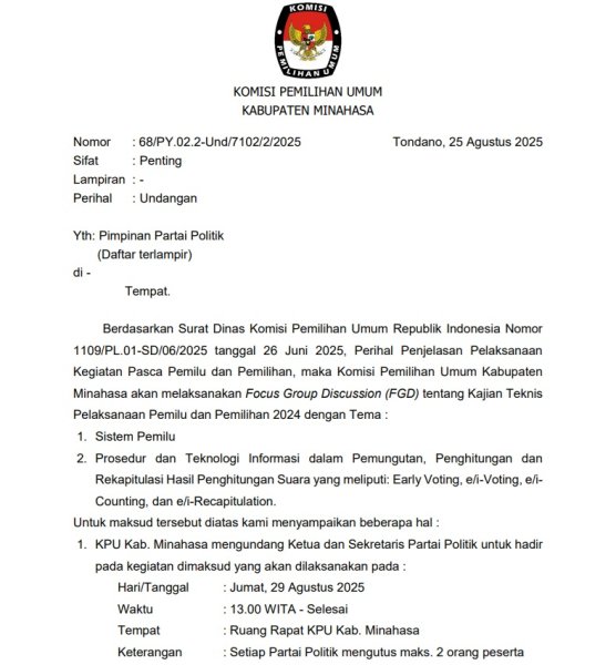 Minahasa, kab-minahasa.kpu.go.id - Komisi Pemilihan Umum (KPU) Kabupaten Minahasa menggelar Focus Group Discussion (FGD) terkait Kajian Teknis Pemilu dan Pemilihan: Sistem Pemilu serta Prosedur dan Teknologi Informasi dalam Pemungutan, Penghitungan, dan Rekapitulasi Hasil Penghitungan Suara. Kegiatan tersebut dilaksanakan di aula Kantor KPU Minahasa, jumat (29/8/2025), dan dihadiri oleh Ketua dan Anggota KPU Minahasa, Sekretaris, Kasubag dan staf sekretariat KPU Kabupaten Minahasa, Komisioner Bawaslu MInahasa, pimpinan partai politik, dan pemantau pemilu.