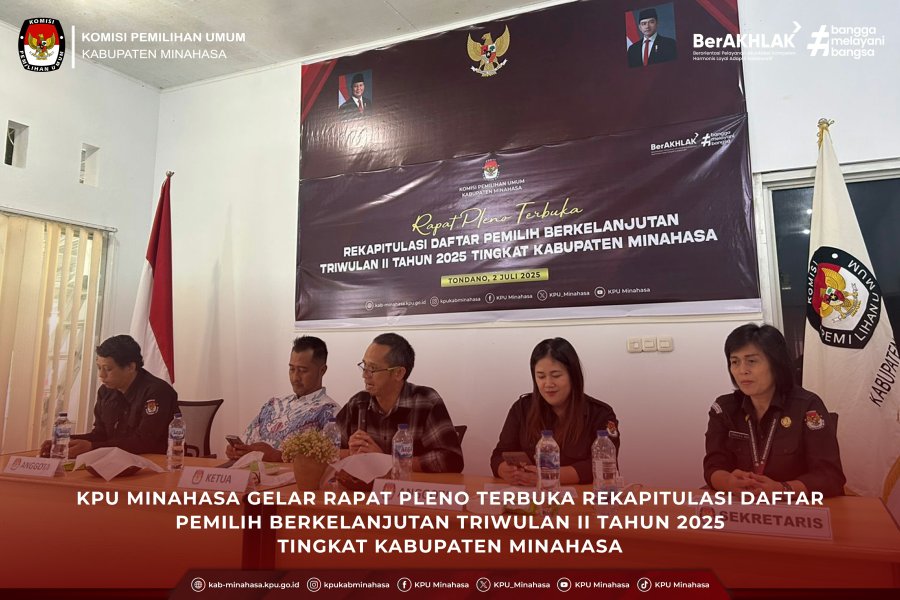 Minahasa, kab-minahasa.kpu.go.id - KPU Minahasa Gelar Rapat Pleno Terbuka Rekapitulasi Daftar Pemilih Berkelanjutan Triwulan II Tahun 2025 Tingkat Kabupaten Minahasa di Aula Kantor KPU Minahasa pada Rabu(02/07/2025).