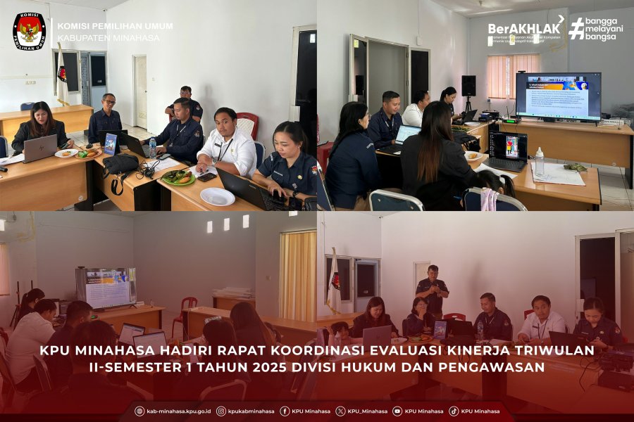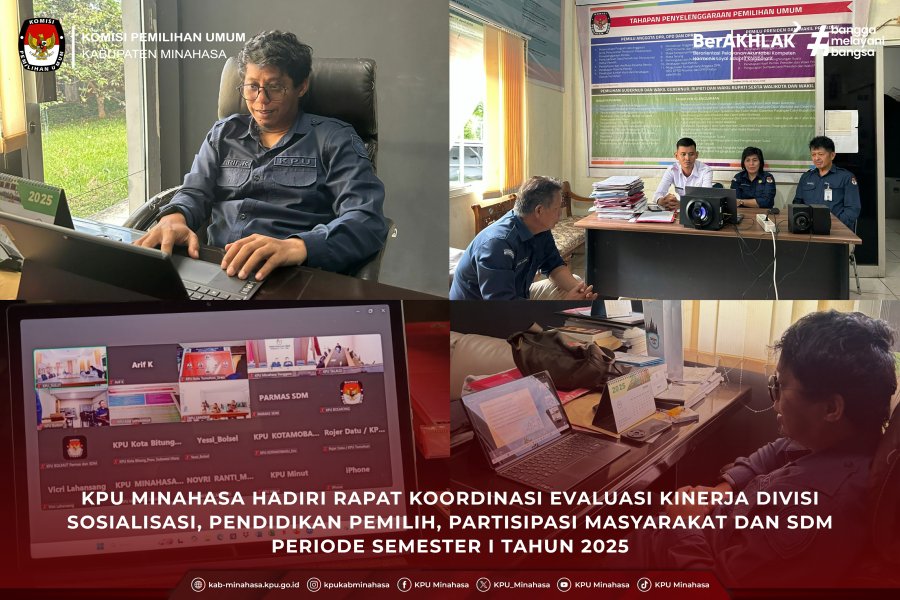 Minahasa, kab-minahasa.kpu.go.id - KPU Minahasa hadiri Rapat Koordinasi Evaluasi Kinerja Divisi Sosialisasi, Pendidikan Pemilih, Partisipasi Masyarakat Dan SDM Periode Semester I Tahun 2025 secara Hybrid melaluai aplikasi Zoom Meeting di Kantor KPU Minahasa pada Selasa(01/07/2025).