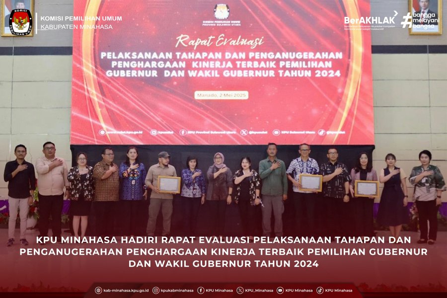 Manado, kab-minahasa.kpu.go.id - KPU Minahasa hadiri Rapat Evaluasi Pelaksanaan Tahapan Dan Penganugerahan Penghargaan Kinerja Terbaik Pemilihan Gubernur Dan Wakil Gubernur Tahun 2024, bertempat di Ghara Gubernuran (Jumat, 2/5/2025).