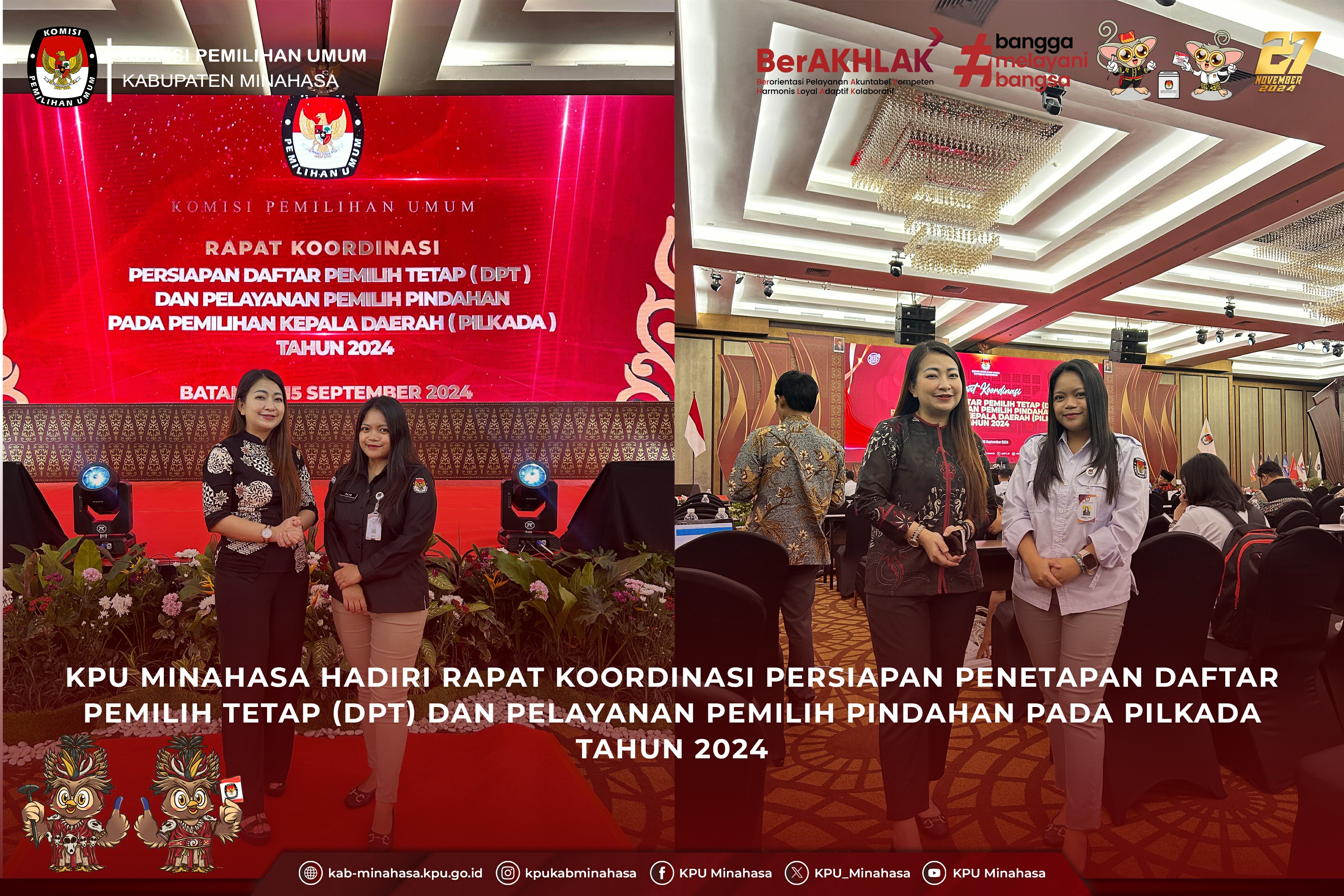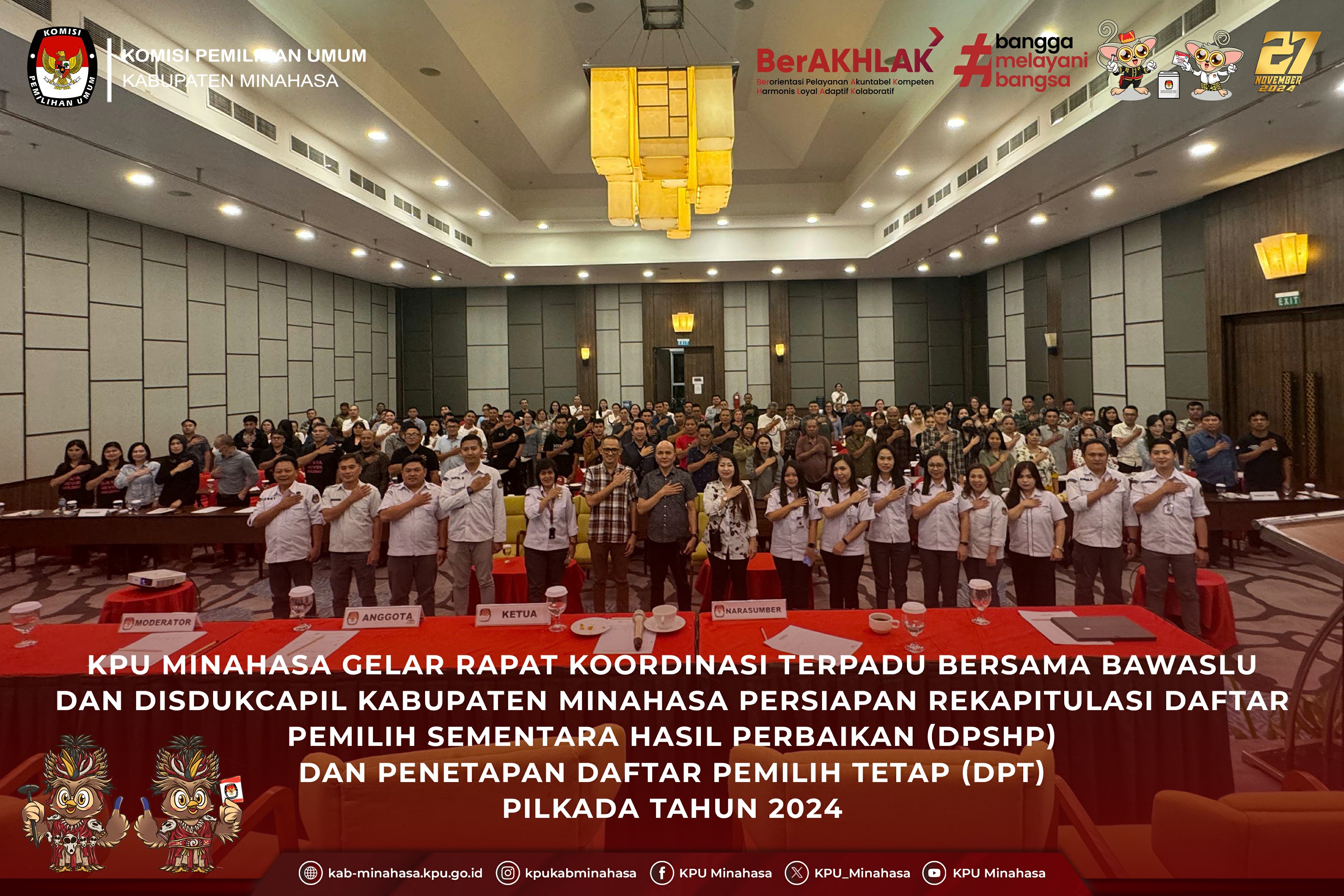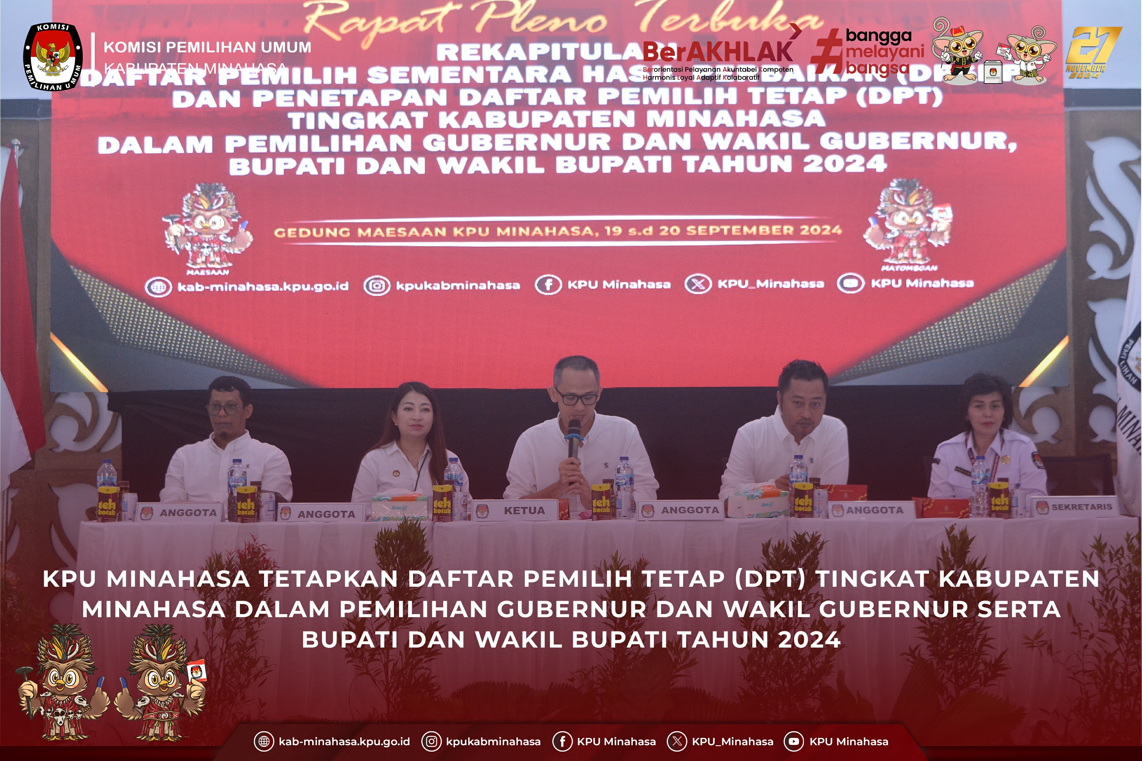kab-minahasa.kpu.go.id - #TemanPemilih, KPU Kabupaten Minahasa menggelar Rapat Pleno Terbuka Rekapitulasi dan Penetapan Daftar Pemilih Tetap (DPT) Tingkat Kabupaten Minahasa dalam Pemilihan Gubernur dan Wakil Gubernur serta Pemilihan Walikota dan Wakil Walikota Tahun 2024, bertempat di Gedung Maesaan KPU Minahasa, Kamis (19/09/2024) s.d. Jumat (20/09/2024). Kegiatan diawali dengan sambutan oleh Pj. Bupati Minahasa Dr. Jemmy Stani Kumendong M.Si, melalui Asisten 1 Bidang Pemerintahan dan Kesra; Drs. Riviva Maringka M.Si. Beliau menyampaikan apresiasi atas kinerja KPU dengan BAWASLU yang melakukan tahapan pemutakhiran ini secara sinergis sehingga harapannya terwujudnya Pilkada yang demokratis dan bermartabat. Dilanjutkan dengan arahan sekaligus membuka kegiatan oleh Ketua KPU Kabupaten Minahasa; Rendy V. J. Suawa didampingi Anggota Lidya A. Malonda, Rijali A. H. I Soerotinojo, Arif Kurniawan serta Sekretaris; Stella S. Sompe. Selanjutnya, Rapat Pleno dipimpin oleh Ketua KPU Kabupaten Minahasa; Rendy V. J. Suawa. Masing-masing kecamatan menyampaikan hasil Rekapitulasi DPSHP di Tingkat Kecamatan dan langsung ditanggapi oleh BAWASLU Kabupaten Minahasa. Setelah dinyatakan sah, dilanjutkan dengan penandatanganan Berita Acara Penetapan DPT dan Penyerahan Berita Acara Pleno, dan diakhiri dengan foto bersama. Daftar Pemilih Tetap (DPT) disahkan untuk Kabupaten Minahasa berjumlah 254.783 Pemilih dengan rincian Laki-laki 128.483 Pemilih dan Perempuan 126.300 Pemilh yang tersebar di 25 Kecamatan, 270 Desa/Kelurahan dan 577 TPS. #KPUMelayani #PilkadaSerentak2024