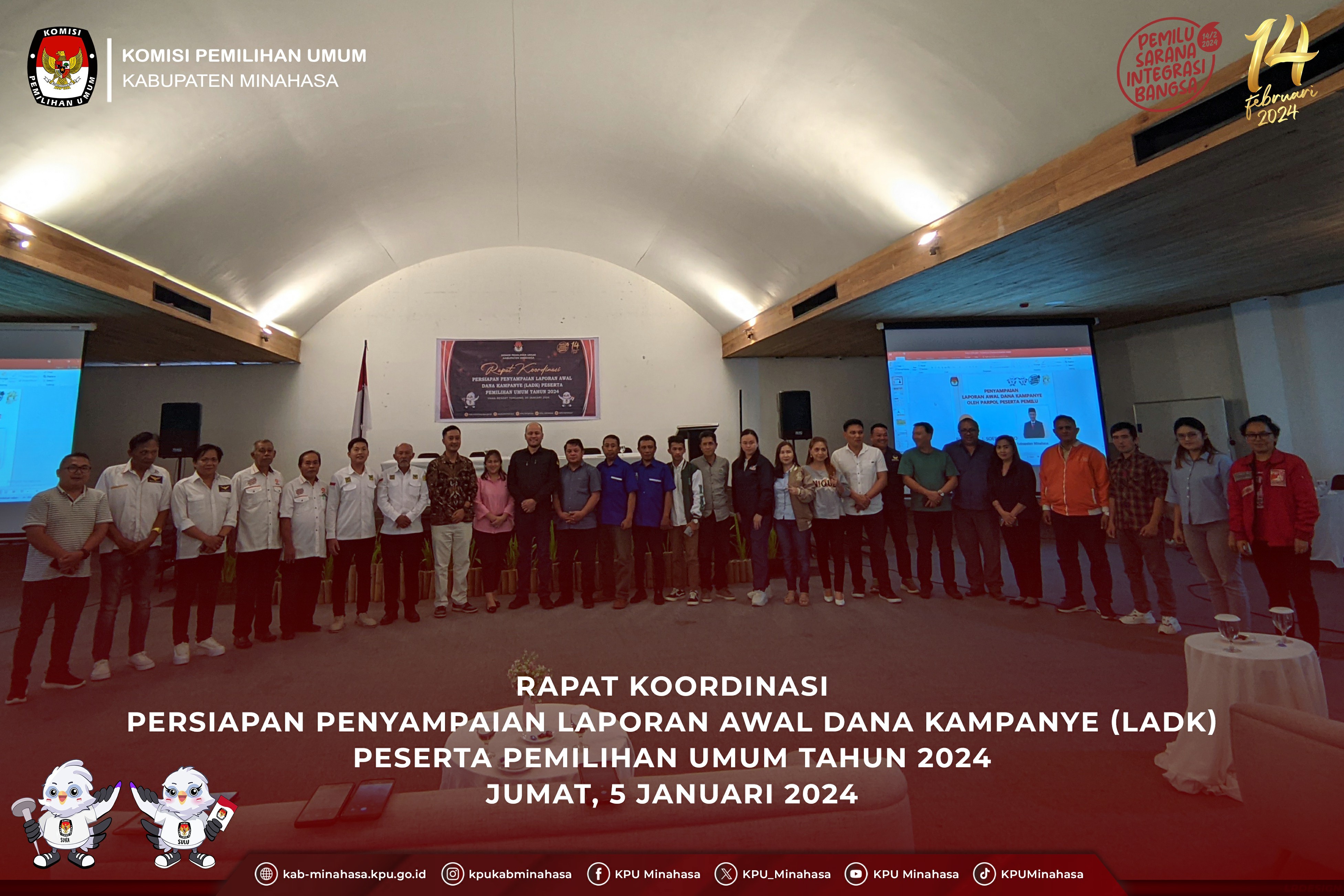 #TemanPemilih, KPU Kabupaten Minahasa melaksanakan Rapat Koordinasi Persiapan Penyampaian Laporan Awal Dana Kampanye (LADK) Peserta Pemilihan Umum Tahun 2024 pada Jumat, 5 Januari 2024 bertempat di Yama Resort Tondano. Hadir dalam kegiatan Ketua Divisi Teknis Penyelenggaraan; Rijali A. H. I. Soerotinojo, Ketua Divisi Sosialisasi Pendidikan Pemilih, Partisipasi Masyarakat dan SDM; Arif Kurniawan, Ketua Divisi Hukum dan Pengawasan; Aprila Regar, Partai Politik Peserta Pemilu 2024, dan jajaran sekretariat.
