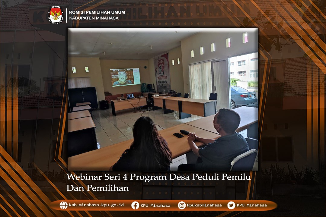 Selasa, 5 Oktober 2021 pukul 14.30 WITA KPU Minahasa Divisi Sosialisasi, Pendidikan Pemilih dan Partisipasi Masyarakat Peter Maweikere dan Plt. Sub bagian Tekmas Rouna Rompas mengikuti Webinar Desa Peduli Pemilu dan Pemilihan (DP3) Seri 4 dengan tema "Pendidikan Pemilih dalam Pencegahan Politik Uang pada Pemilu dan Pemilihan". Acara dibuka oleh ketua KPU RI Ilham Saputra mengatakan bahwa kegiatan webinar merupakan salah satu program KPU RI dalam rangka mensukseskan pendidikan pemilih. dan sebagai pengantar program yakni Anggota KPU RI Ketua Divisi Sosialisasi, Pendidikan Pemilih dan Parmas, I Dewa Kade Wiarsa Raka Sandi