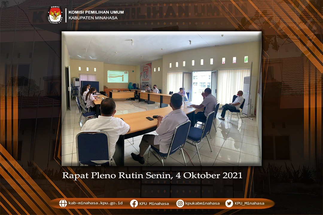Komisi Pemilihan Umum Kabupaten Minahasa mengadakan Rapat Pleno Rutin yang dimulai pukul 09.00 WITA bertempat di ruang rapat KPU Minahasa, Senin 04 Oktober 2021. Membahas tentang Laporan Kinerja atau mengevaluasi kegiatan yang telah diprogramkan untuk dilaksanakan, maupun pembahasan tentang rencana atau program kerja dari masing-masing divisi yang ada di KPU Minahasa (Divisi KUL, Divisi Hukum & Pengawasan, Divisi Program & Data, Divisi Teknis & Partisipasi Masyarakat), dalam Rapat ini telah menetapkan program kegiatan selama seminggu. Rapat Pleno Rutin ini dilaksanakan dalam rangka untuk memperbaiki kinerja pegawai di masing-masing sub bagian khususnya dan meningkatkan kinerja KPU Minahasa pada umumnya. Rapat Pleno ini dipimpin langsung oleh Lord A.Ch. Malonda selaku Ketua KPU Minahasa dengan dihadiri oleh seluruh Anggota KPU Minahasa, yakni Kristoforus Ngantung, Peter Maweikere, Rendy Suawa, Lidya A. Malonda, Meidy R. Malonda selaku Sekretaris KPU Minahasa, Jan Ch. Kumaunang selaku Kasubbag Program & Data, Sheilla Warouw selaku Kasubbag KUL, Rouna Rompas selaku Plt. Kasubbag Tekmas, Jimmy Lucas selaku Plt Kasubbag Hukum, Immanuel Liwe selaku Staff Subbag Hukum yang juga berperan sebagai notulen, dan Surya Darma selaku Staff Subbag Program & Data dan juga berperan sebagai operator di KPU Minahasa. Rapat Pleno berjalan dengan baik dan lancar, selanjutnya melaksanakan tugas pokok dan fungsi ASN terdiri dari PNS dan Non PNS di KPU Minahasa. (TEKMAS)