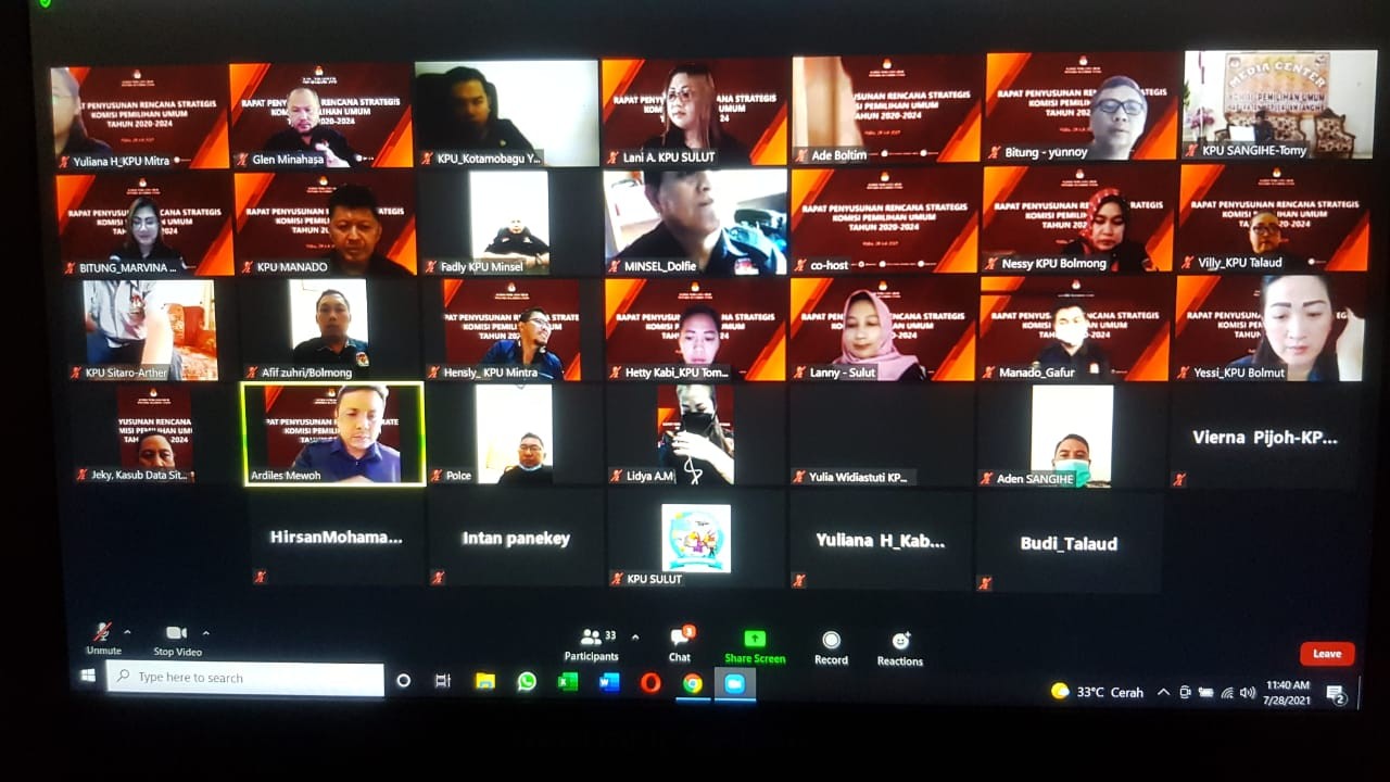 Pada hari Rabu tanggal 28 Juli 2021, KPU Kabupaten Minahasa mengikuti Rapat Terkait Penyusunan Rencana Strategis Komisi Pemilihan Umum secara daring sesuai dengan Undangan Nomor 299/TIK.05-Und/71/Prov/VII/2021 dengan Peserta Rapat Anggota KPU Kabupaten Minahasa Ketua Divisi Perencanaan Data dan informasi Lidya A. Malonda dan Kasubag Perencanaan Data Jan Ch. Kumaunang. Adapun Rapat dibuka oleh Ketua KPU Provinsi Sulawesi Utara, Bapak Ardiles Mewoh yang menekankan bahwa Penyusunan Renstra dikompilasi oleh bagian Perencanaan Data dengan masukan dari divisi-divisi terkait sehingga terjadi sinkronisasi dalam penetapan Rencana Strategis yang akan dilaksanakan selama 2020 – 2024. Dalam Pengarahan yang diberikan oleh Anggota KPU Provinsi Sulawesi Utara selaku Kadiv Perencanaan Data dan Informasi, Ibu Lanny Ointoe menekankan bahwa penyusunan Renstra harus realistis dengan target pencapaian yang akan dilaksanakan dan harus mengacu dan berpedoman pada Keputusan KPU Nomor 357/PR.01.3-Kpt/01/KPU/VI/2021. Selanjutnya pengarahan yang diberikan oleh Anggota KPU Provinsi Sulawesi Utara Ketua Divisi Teknis dan Penyelenggaraan, Ibu Yessy Momongan yang menekankan bahwa Renstra ini adalah Substansi dan tanggung jawab dari masing-masing Devisi yang ada untuk dijadikan acauan dalam pelaksanaan kinerja. Anggota KPU Sulawesi Utara Ketua Divisi SDM dan Parmas, Bapak Salman Saelangi menggaris bawahi bahwa pembahasan Renstra harus dilaksanakan dalam Rapat Pleno Periodik atau juga bisa dalam rapat pleno khusus. Arahan selanjutnya bahwa KPU Kabupaten/Kota harus memperhatikan kemampuan sumber daya yang ada dalam penyusunan sehingga target kinerja sesuai dengan kemampuan SDM yang ada.