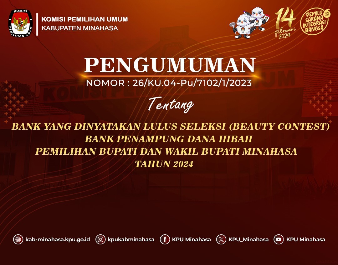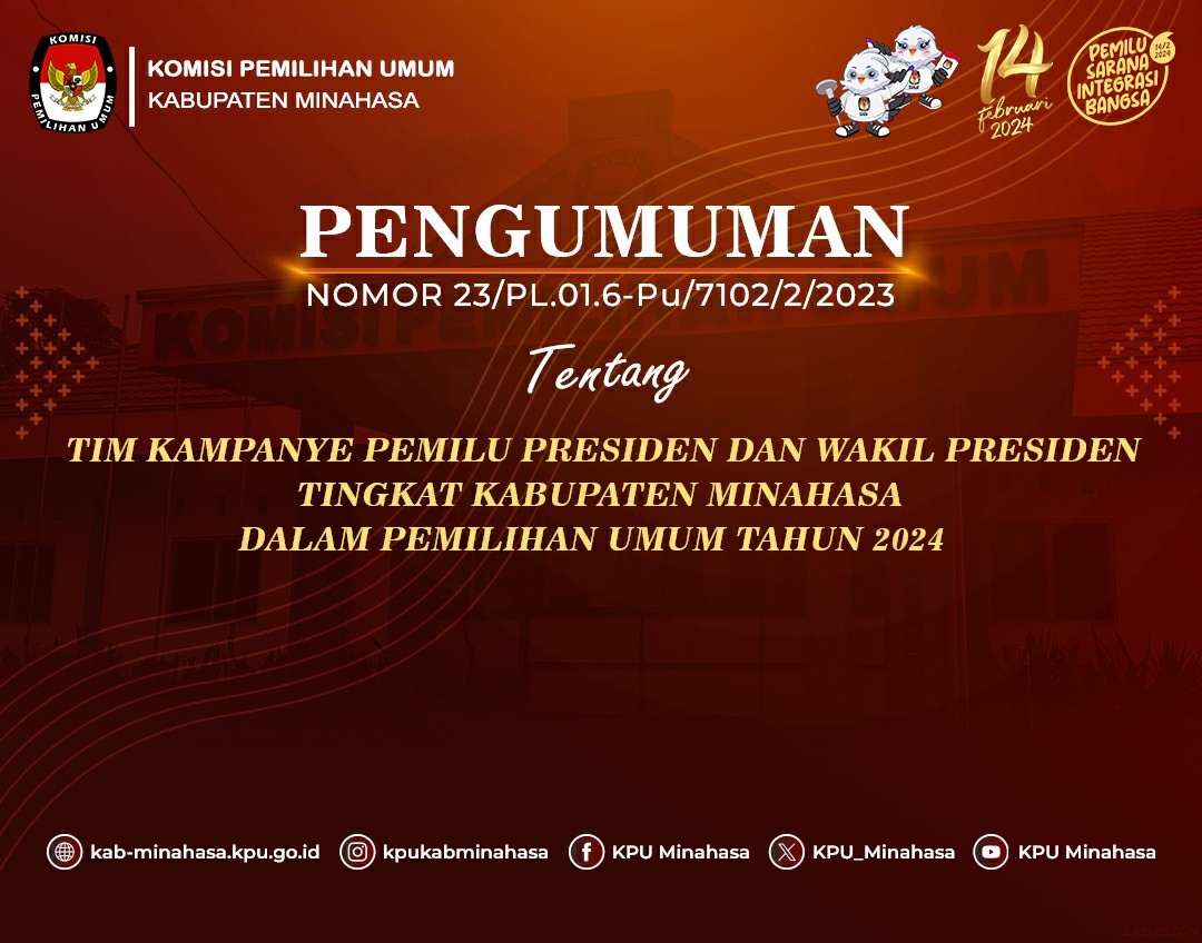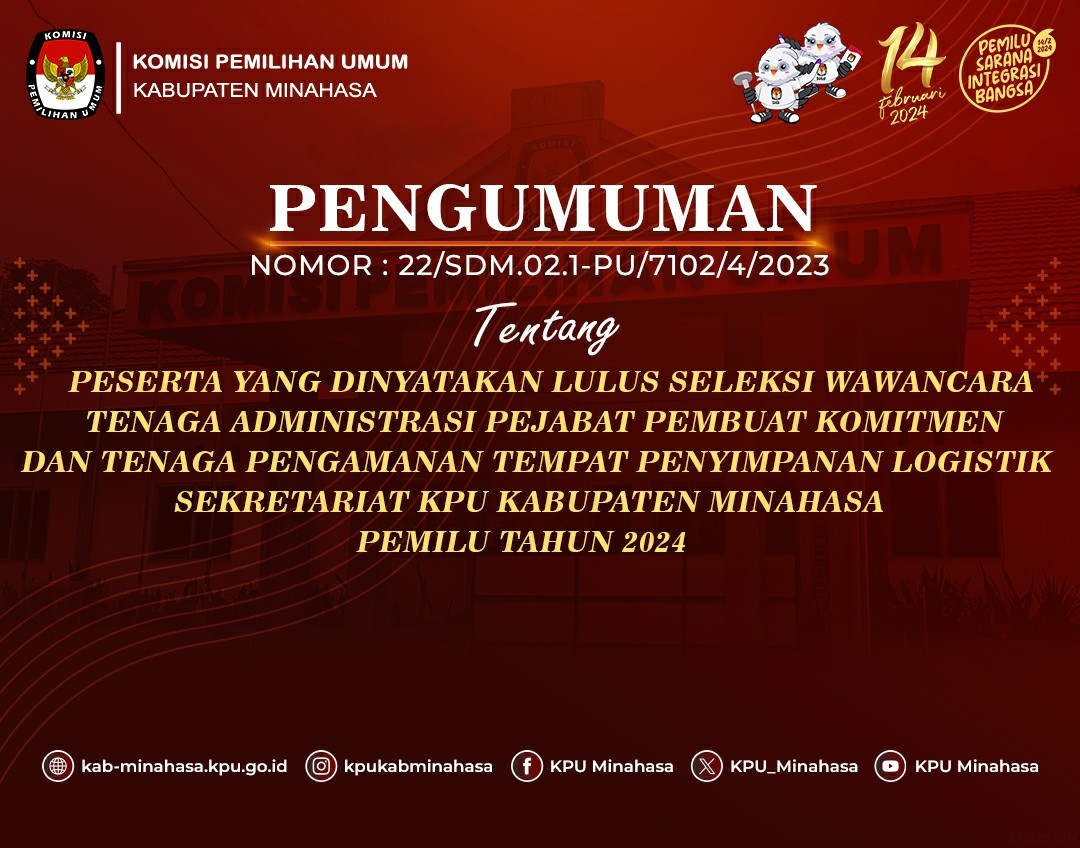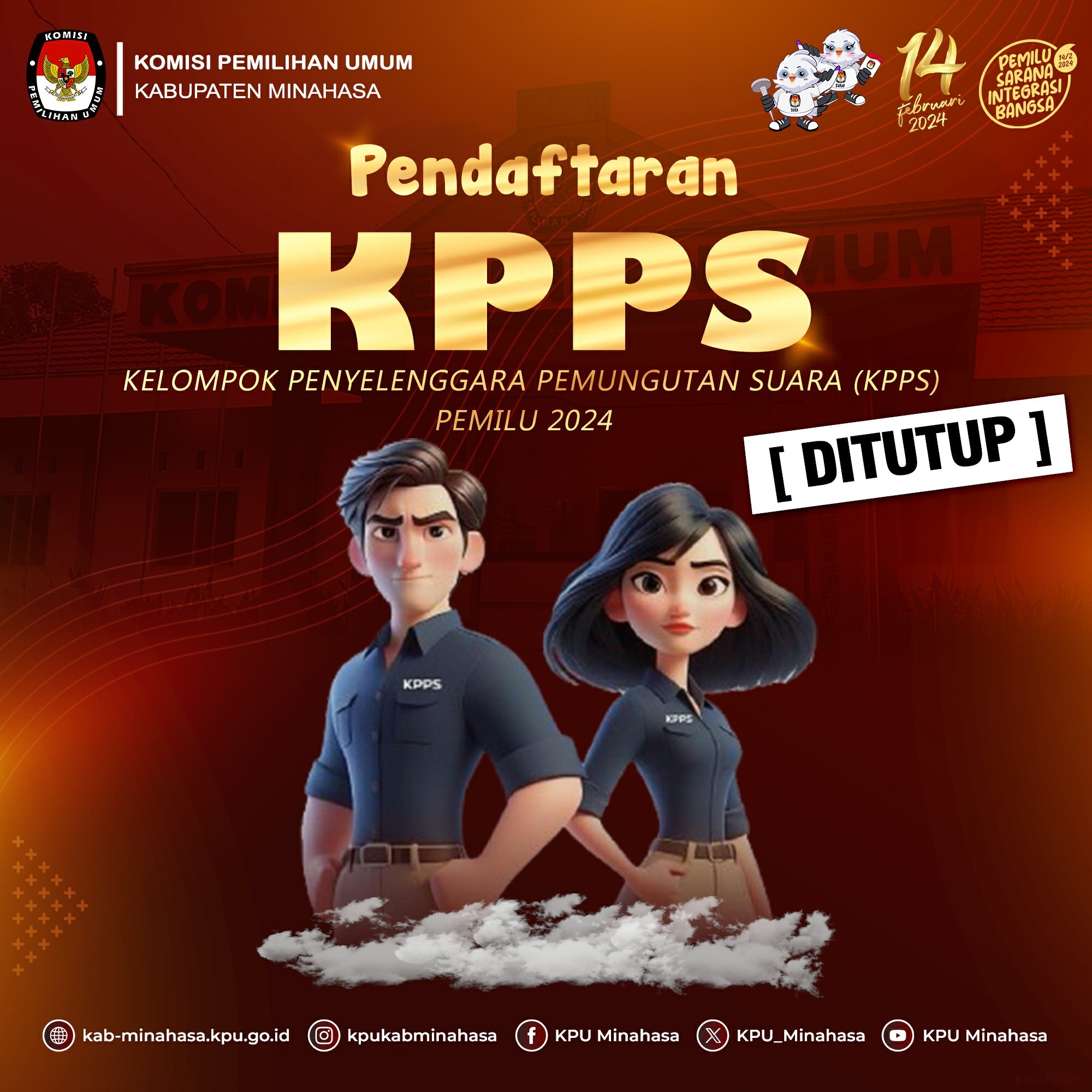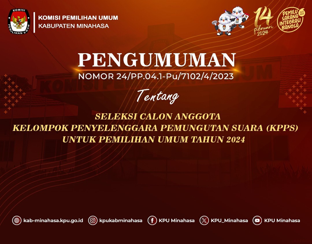 Dalam rangka pembentukan Kelompok Penyelenggara Pemungutan Suara (KPPS) untuk Pemilihan Umum Tahun 2024, Komisi Pemilihan Umum Kabupaten Minahasa mengundang Warga Negara Indonesia yang memenuhi persyaratan untuk mendaftarkan diri menjadi anggota KPPS untuk Pemilihan Umum Tahun 2024 dengan ketentuan sebagai berikut: