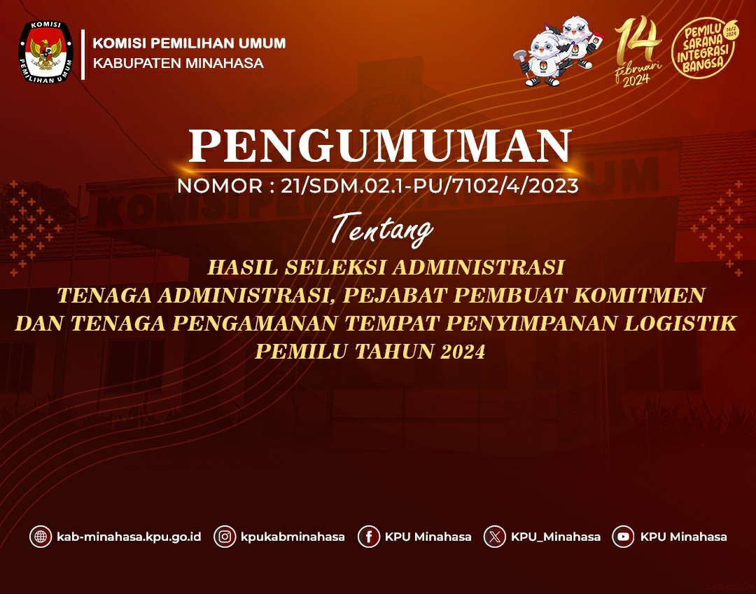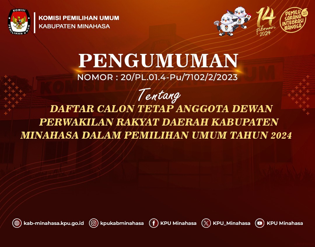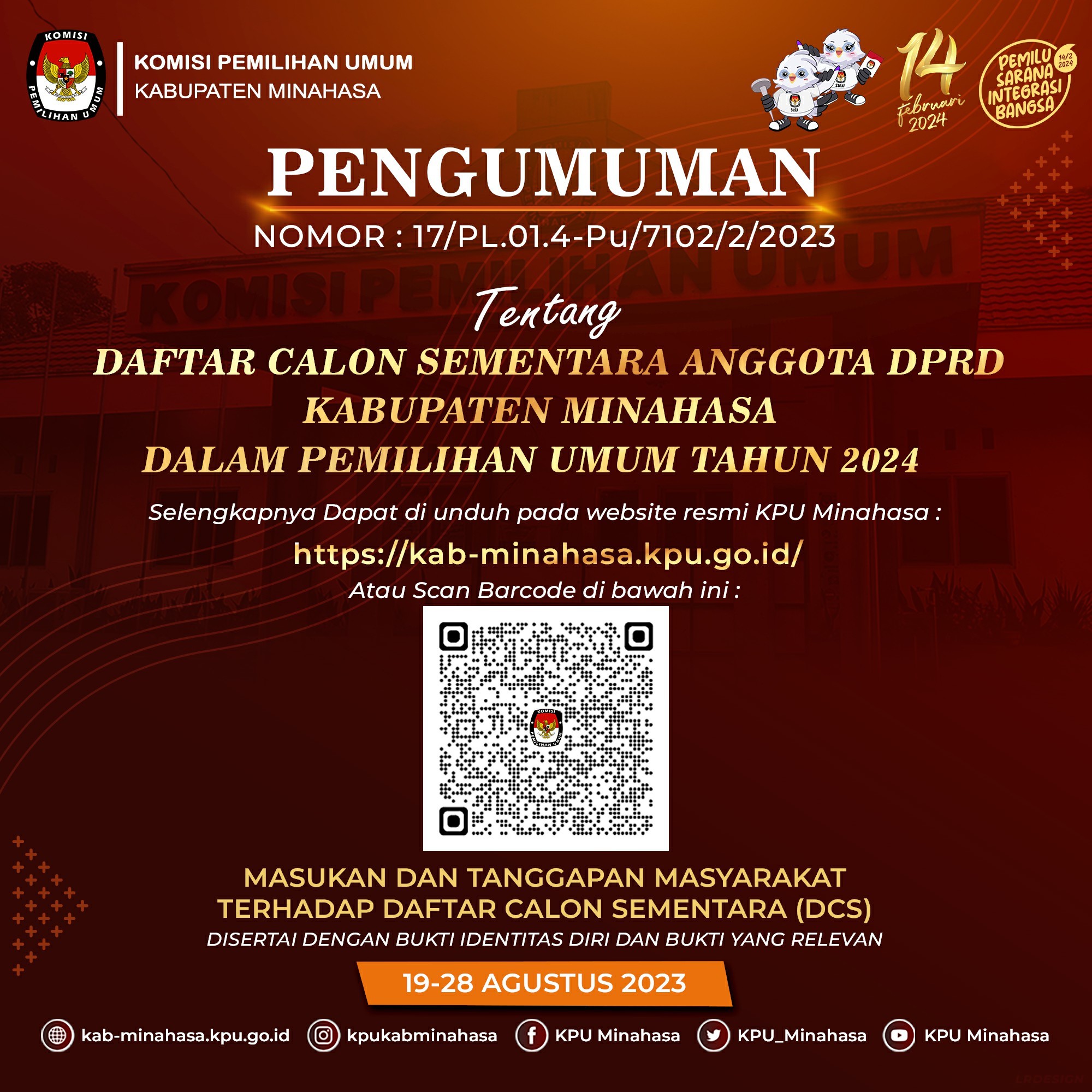 #TemanPemilih, Bahwa untuk melaksanakan ketentuan Pasal 70 Peraturan KPU Nomor 10 Tahun 2023 tentang Pencalonan Anggota Dewan Perwakilan Rakyat, Dewan Perwakilan Rakyat Daerah Provinsi, dan Dewan Perwakilan Rakyat Daerah Kabupaten/Kota, KPU Kabupaten Minahasa mengumumkan Daftar Calon Sementara (DCS) Anggota DPRD Kabupaten Minahasa dan persentase keterwakilan perempuan dalam Daftar Calon Sementara (DCS) sebagaimana terlampir.