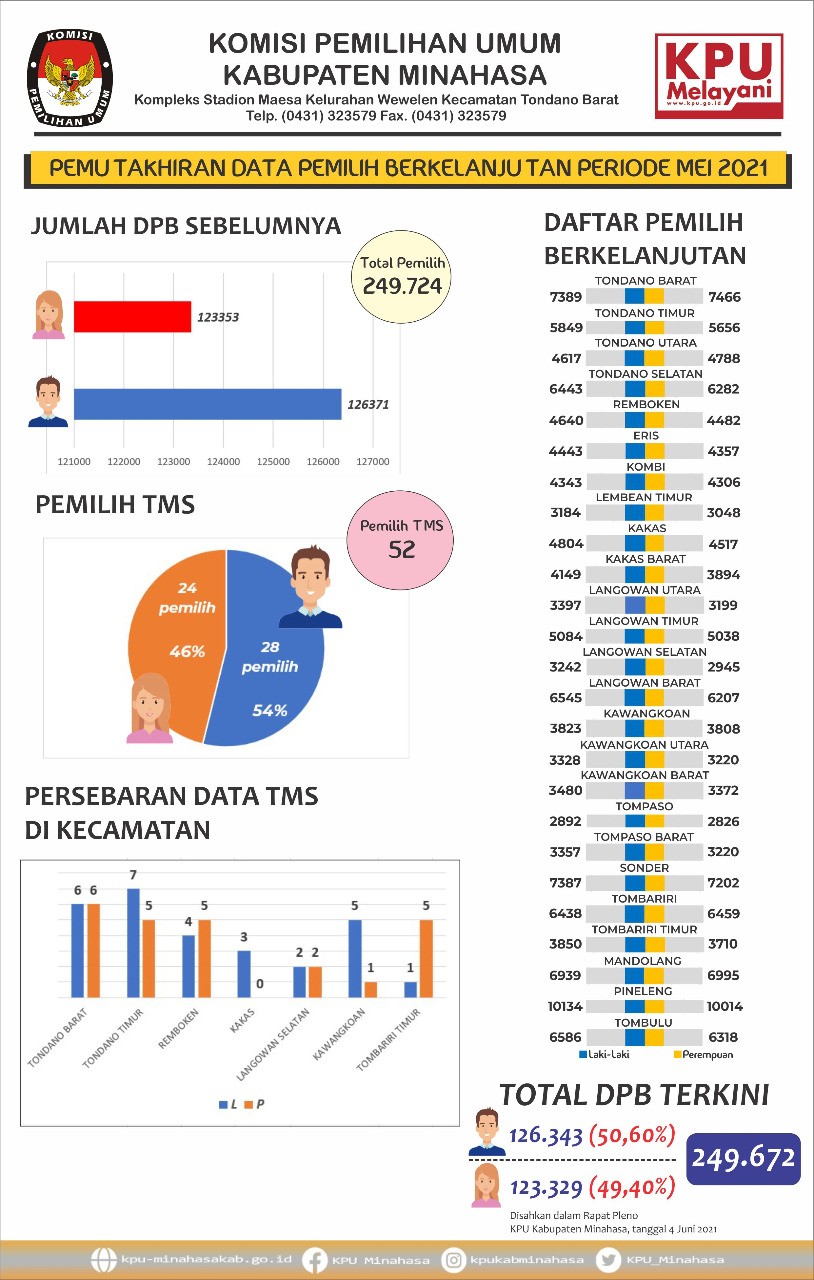 Pada hari Jumat tanggal 2 Juli 2021, KPU Kabupaten Minahasa menyelenggarakan kegiatan Rapat Pleno Rekapitulasi Pemutakhiran Data Pemilih Berkelanjutan yang bertempat di Aula Kantor KPU Kabupaten Minahasa berdasarkan Surat Dinas nomor 366/PL.02-SD/01/KPU/IV/2021 tanggal 21 April 2021 perihal Perubahan Surat Ketua KPU RI Nomor 132/PL.02-SD/01/KPU/II/2021 perihal Pemutakhiran Data Pemilih Berkelanjutan Tahun 2021 yang berbunyi : KPU/KIP Kabupaten/Kota melalukan rekapitulasi Daftar Pemilih Berkelanjutan per bulan. Kegiatan tersebut dibuka oleh Ketua KPU Kabupaten Minahasa, dihadiri oleh Anggota KPU Kabupaten Minahasa Divisi Perencanaan, Data dan Informasi, Anggota KPU Kabupaten Minahasa Divisi Teknis, Anggota KPU Kabupaten Minahasa Divisi SDM dan Parmas, Anggota KPU Kabupaten Minahasa Divisi Hukum dan Pengawasan, Sekretaris KPU Kabupaten Minahasa, para Kasubbag dan staf serta dihadiri pula oleh Ketua Bawaslu Kabupaten Minahasa melalui aplikasi daring Zoom meeting. Berikut adalah rekapitulasi Pemutakhiran Data Pemilih Berkelanjutan Periode Juni 2021 KPU Kabupaten Minahasa dengan jumlah 249.717 pemilih, dimana untuk pemilih laki - laki berjumlah 126.363 pemilih, untuk pemilih perempuan berjumlah 123.354 pemilih yang tersebar di 25 Kecamatan dan 270 Desa/Kelurahan. Dibandingkan rekapitulasi Pemutakhiran Data Pemilih Berkelanjutan Periode Mei 2021 lalu, terdapat penambahan pemilih sebanyak 45 pemilih, dimana ada potensi pemilih baru sebanyak 100 orang dan pemilih yang berstatus TMS sebanyak 55 pemilih.