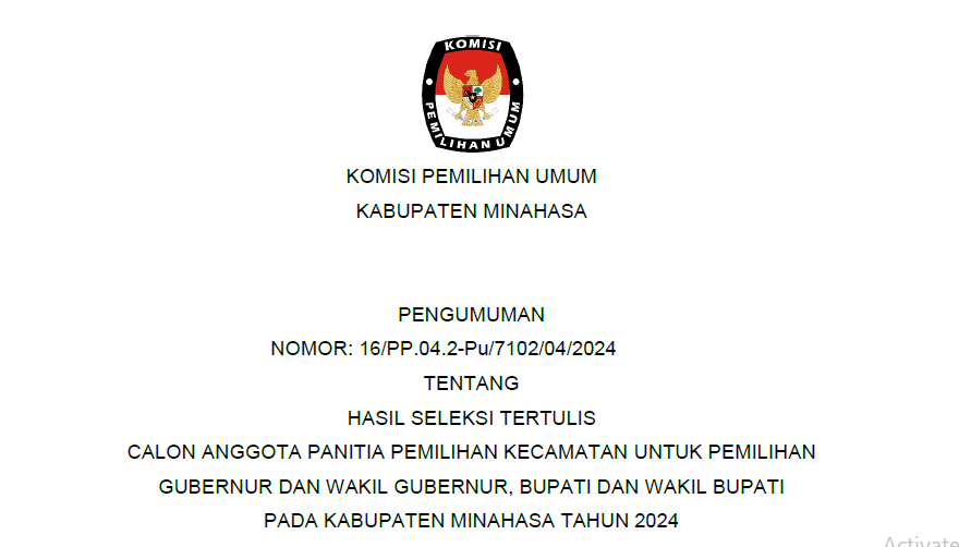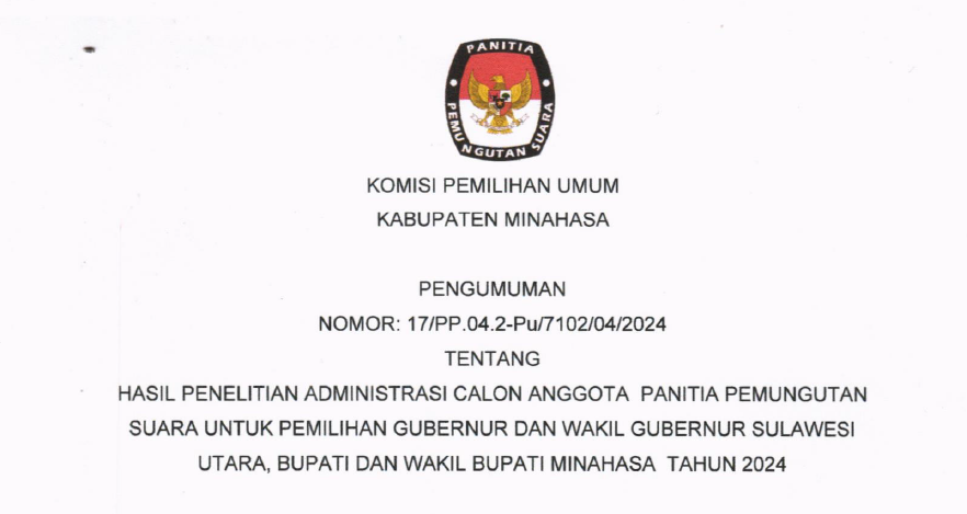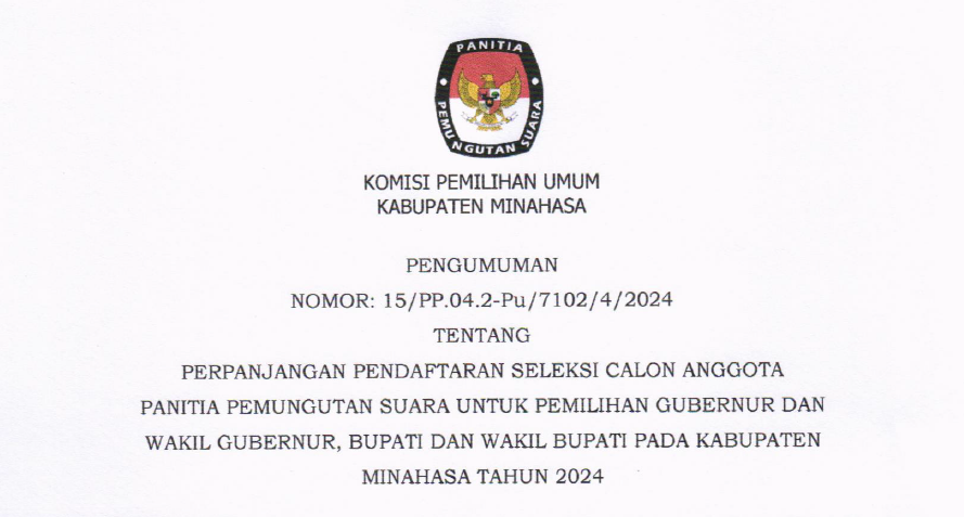 kab-minahasa.kpu.go.id - #TemanPemilih, Sehubungan dengan Komisi Pemilihan Umum Kabupaten Minahasa telah melaksanakan tahapan Seleksi Tertulis Calon Anggota Panitia Pemilihan Kecamatan untuk Pemilihan Gubernur dan Wakil Gubernur, Bupati dan Wakil Bupati Tahun 2024, disampaikan beberapa hal sebagai berikut: