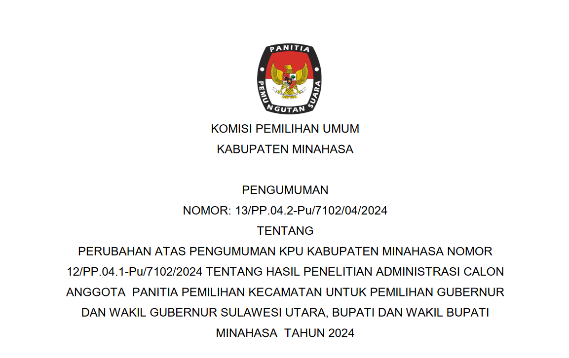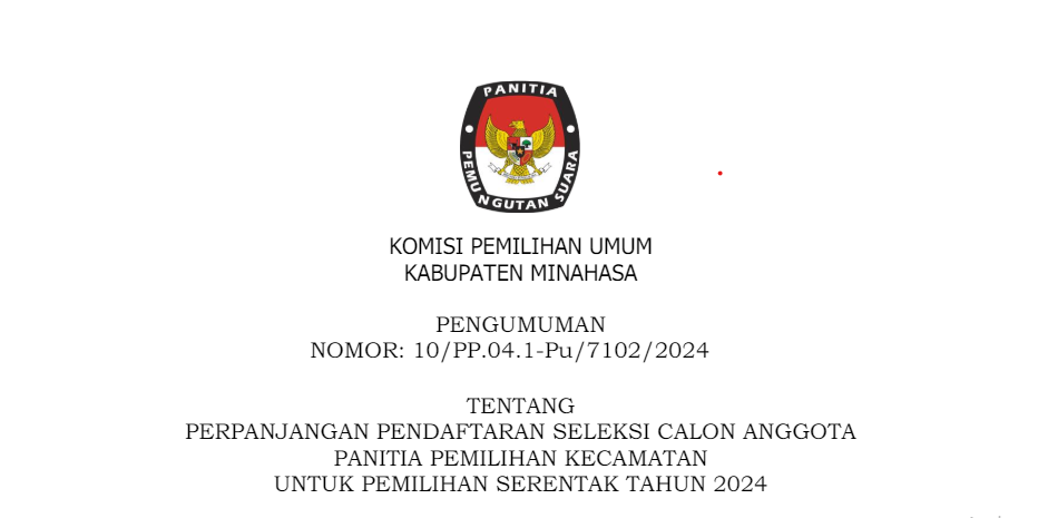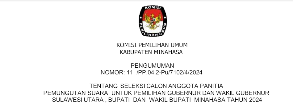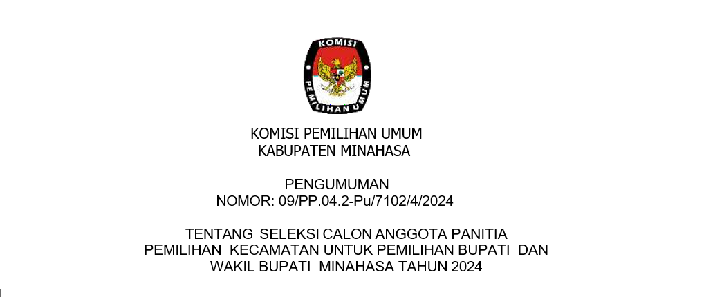kab-minahasa.kpu.go.id - #TemanPemilih, Dalam rangka pembentukan Calon Anggota Panitia Pemilihan Kecamatan untuk Pemilihan Bupati dan Wakil Bupati Minahasa Tahun 2024, Komisi Pemilihan Umum Kabupaten Minahasa mengundang Warga Negara Indonesia yang memenuhi kualifikasi untuk mendaftarkan diri menjadi anggota Panitia Pemilihan Kecamatan untuk Pemilihan Bupati dan Wakil Bupati Minahasa Tahun 2024.